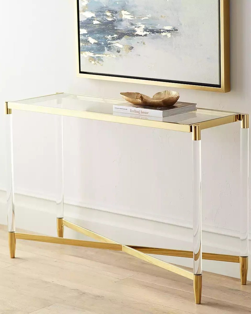 Золотая консоль «Ясмин» — это элегантное сочетание прочности и воздушности. Прямоугольная форма и закалённое стекло в качестве столешницы создают лёгкость и современный стиль. Металлическая каёмка из нержавеющей стали, выполненная в полированном золотистом оттенке, обрамляет столешницу и нижнюю часть ножек, придавая изделию изысканность и роскошный вид. Эта консоль идеально впишется в интерьер, добавив ему шарма, а в комплект можно добавить кофейный и журнальный столики из той же коллекции для завершённого образа.