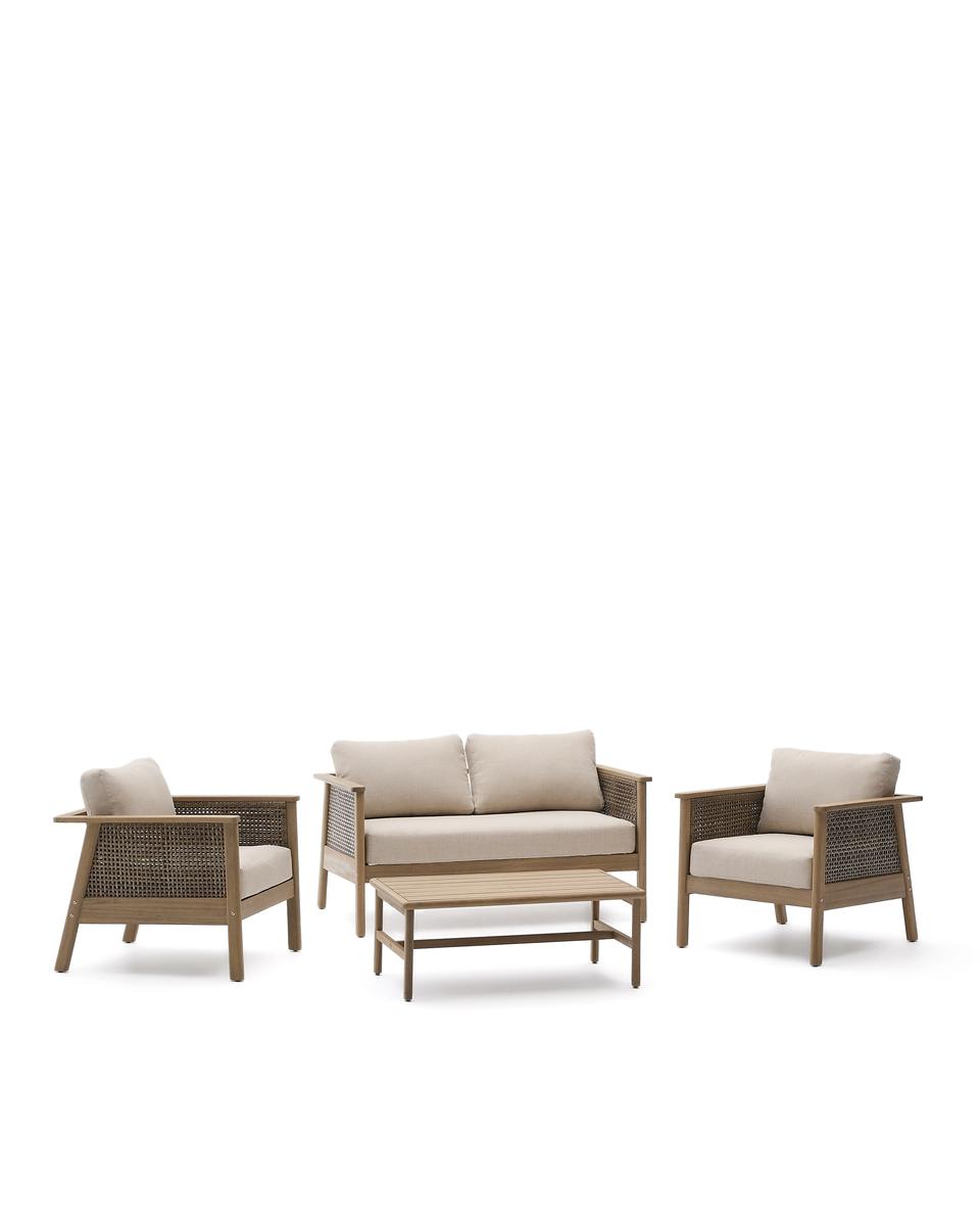 Alabe отличается универсальным и прочным дизайном, идеально подходящим для создания уютной атмосферы как в помещении, так и на улице. Его конструкция и синтетические шнуры из ротанга на сиденье устойчивы к ультрафиолетовым лучам. Древесина акации, из которой он изготовлен, выглядит тепло и естественно, а также имеет сертификат FSC 100%, который гарантирует ответственное лесопользование. Мы рекомендуем ежегодно наносить на него средство для защиты древесины Sterina, чтобы сохранить его внешний вид и продлить срок службы. Подушки, разработанные для обеспечения максимального комфорта, имеют пенопластовые и водоотталкивающие чехлы, что делает их идеальными для повседневного использования. Они также снимаются для легкой чистки, позволяя содержать весь комплект в безупречном состоянии. Под сиденьями расположены белые лямки, придающие сиденьям изысканность и дополнительную поддержку.