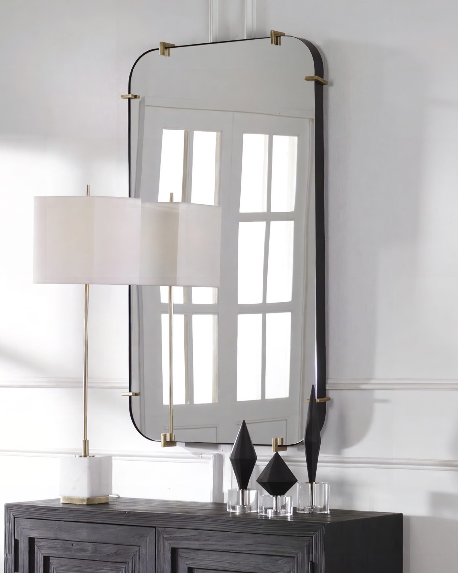 Настенное зеркало в раме «Пали» — это идеальное решение для тех, кто ценит современный и индустриальный стиль в интерьере. Основным преимуществом зеркала «Пали» является его стильная рама из черного металла. Черный цвет придает зеркалу современность вид, рама зеркала украшена небольшими декоративными деталями в цвете латунь. Золотые элементы также слегка состарены, что придает зеркалу привлекательности и делает его еще более интересным. Благодаря своим размерам, «Пали» будет отлично смотреться в любой комнате вашего дома — в прихожей, гостиной, спальне или даже в ванной комнате. Это зеркало не только будет служить вашему основному предназначению — отражать, но и создаст впечатление пространства и света в помещении. Настенное зеркало «Пали» поможет создать уютную и стильную атмосферу в вашем доме!