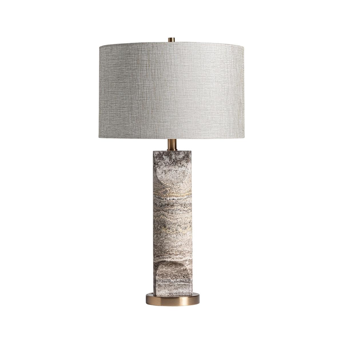 Настольная лампа в стиле ар-деко, изготовленная из серого мрамора в сочетании с золотистым железом и серым полиэстером. Изделие разборное.