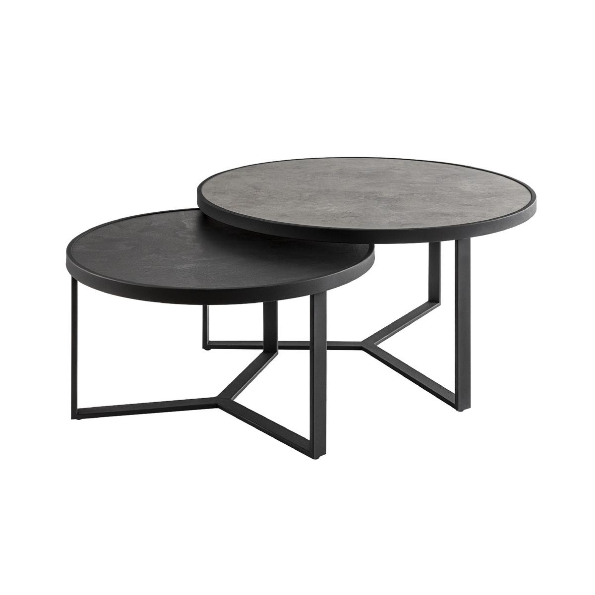 Набор небольших приставных столиков из металла черного матового цвета.